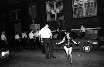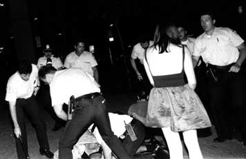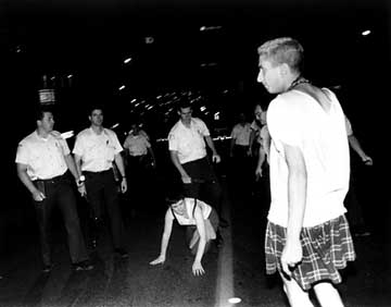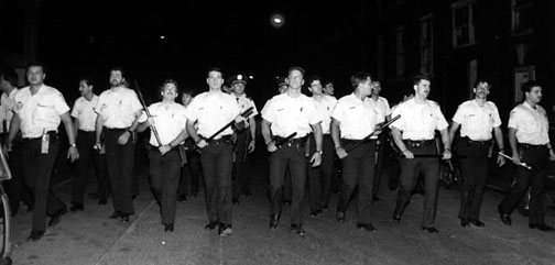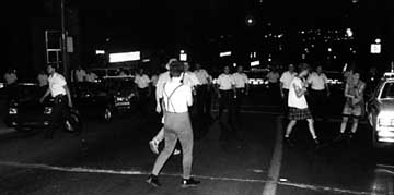 The first thing I encountered when I emerged from the party was a cluster of police officers facing the only exit door. Estimates range from 32 to 40 cops- and 16 police vehicles from the Main Station and Station 25... which was a police station from outside of the area. People from the party were overwhelmed by the unexpectedly large police presence and reports of the brutality which had occurred. Some fled immediately, but others watched transfixed as the police regrouped in battalion formation, effectively blocking off exits and access to cars and bicycles. At this point the police were still wearing their identification badges, seen pinned on their left hand shirt pockets. They advanced on us, sticks in hand. I was in an awkward position as I was carrying only a 28 mm wide angle lens, which required that I come in quite close to my subjects in order to get any detail! My flash batteries were also dying, so I had to wait between recharges in order to take another shot, and, of course, every time I did, my location was instantly recognizable... I was the only photographer present, so I felt it my responsibility to document what was happening, but my friends were understandably anxious for me- and the film!