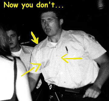 The crowd, believing themselves under attack for their sexual orientation, shouted back, "We're here, we're queer, we're proud of it!" etc. and two men allegedly exposed their buttocks to the cops...(ok,it did happen!)The outcome was that the police began to remove their identification badges in front of us. It was strange to watch them eying us as they did this, and suddenly realizing what they intended. (It is illegal, by the way, for them to remove their IDs- though the beating of citizens appears to be permitted- in any event, they got away with both.) The cop, to the right in the picture below, seemed transfixed by me for some reason. We stared each other down until his comrades, fearing either for his psychic or psychological welfare, suddenly grabbed him and removed his ID badge for him. One would have thought them drugged, to judge by their expressions.