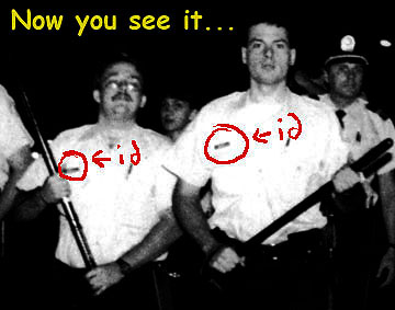 Note that the only cop still wearing his ID is holding a megaphone and shouting directives, not engaged in the beatings (second from left in rear).