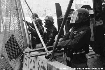 The photograph David took of me with my masked friend was the last time he ever photographed me. David Barker-Maltby, Nov. 12, 1962 - May 17, 2001, died of bacterial meningitis in Toronto on May 17th. We have known each other as friends and as fellow photographers since the early 80s. On the afternoon of April 21st, when David realized that I was having trouble making the stairs and breathing due to some heavy medication I was on, he waited for me and then watched my back while we photographed the teargassing and stand-off between protesters and police together (the photos on this page). In the video, he is the photographer in green. I finally lost him up there and so never got a chance to say good-bye, or thank him properly. David was a loyal friend and a wonderful photographer. I'll miss him. Good-bye, David, and thank-you...