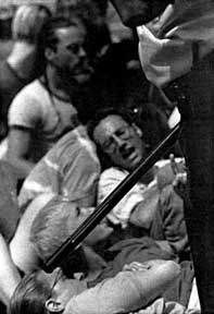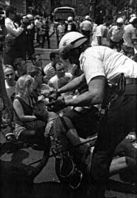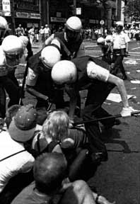 One of the cops signalled and they all moved on us at once, taking us down row by row. I was the third row in, the 2 leather guys on my left and a young girl to my right. We clung onto each other's arms and watched in horror as they progressed towards us, smashing people and dragging them away. The poor girl directly in front of us received the full force of a matraque under her ribcage. I felt the leather guy's arm rip from my grasp and saw a flash of them being hit - severely. We were next. I turned to the girl beside me and said, "Don't look at them- look down..." Besides being afraid of a disfiguring hit in the face, I didn't want to look up into their eyes and show fear- which would have been unavoidable; I was truly scared but refused to give them that satisfaction. I don't recall being hit- it was all a blur. I found myself being pushed into a waiting police wagon full of people, surprised to see sidewalk burns on my upper arm as I didn't recall being dragged on the ground. Others were in far worse shape than I- nasty greenish-yellow bruises beginning to appear on their bodies. I suspected that perhaps the cops had handled me a bit more carefully due to the publicity my photos had received. It was awful in the wagon. Besides being hot, anxious and packed in like sardines, we could hear terrible screaming outside but couldn't see or do a thing. Then the vehicle started its engine and drove us aimlessly around town for what seemed to be an hour, until we were finally returned to the original location and brought into Station 25. |