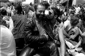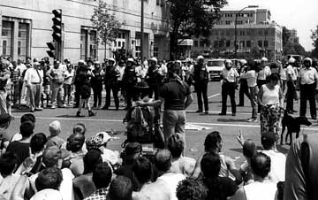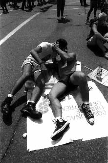 Things began on a playful note. We blocked the intersection, people made out, and chants such as, "We're here, we're queer, we're FABULOUS!" and (directed at the cops and on-lookers), "We're here, we're queer, and so are some of YOU!" were heard. Cops perched on the roof of Station 25 photographed us. Uniformed firemen came out to watch from the fire station next door, which provoked a more enthusiastic response from the guys in the crowd!