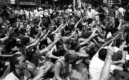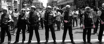 It's entirely possible that the police had asked us to disperse- who could hear them? Besides, no-one was really into obeying their directives as a point had to be made. A rumour began to filter through the crowd- someone had been informed as to the strategy the police were going to take, to arrest and beat us! They would operate in pairs- the first would attempt to move us- if we didn't immediately co-operate, the other would lay into us with their matraque. It was a very cold and methodical plan, obviously calculated to instill fear in us, and it began to hit home that they were really intending another beating- witnesses or no! They surrounded us in a square formation- more than 70 police clad in riot gear and some with latex gloves to protect themselves from Aids... their identification badges again illegally removed or hidden from view by their vests.