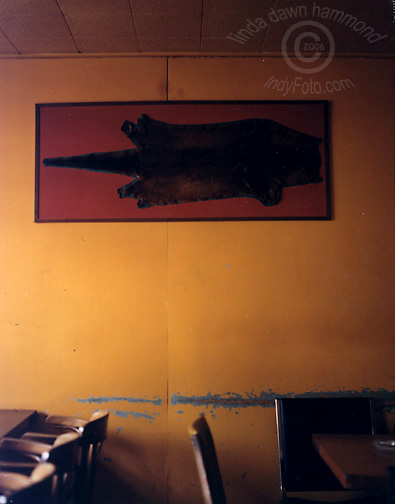 Bear Skin ©Linda Dawn Hammond 1981My mostly male clients were generally sweet to me, which probably had as much to do with my gender as anything else- fresh female blood of all varieties being highly coveted after the long winter. After I left Dawson in September to hitchhike to Alaska, I was standing on the street of another Yukon town hundreds of miles to the South, when a male voice called over, "How are things at the PIT?" It turned out that he and a friend had travelled all the way to Dawson just to have a beer at the Pit because they'd heard tell of a "cute, new barmaid". Only to look, mind you, as they hadn't even bothered to speak to me beyond ordering! I was touched- which only betrays my naivete in believing this to have been the sole purpose of their trip!